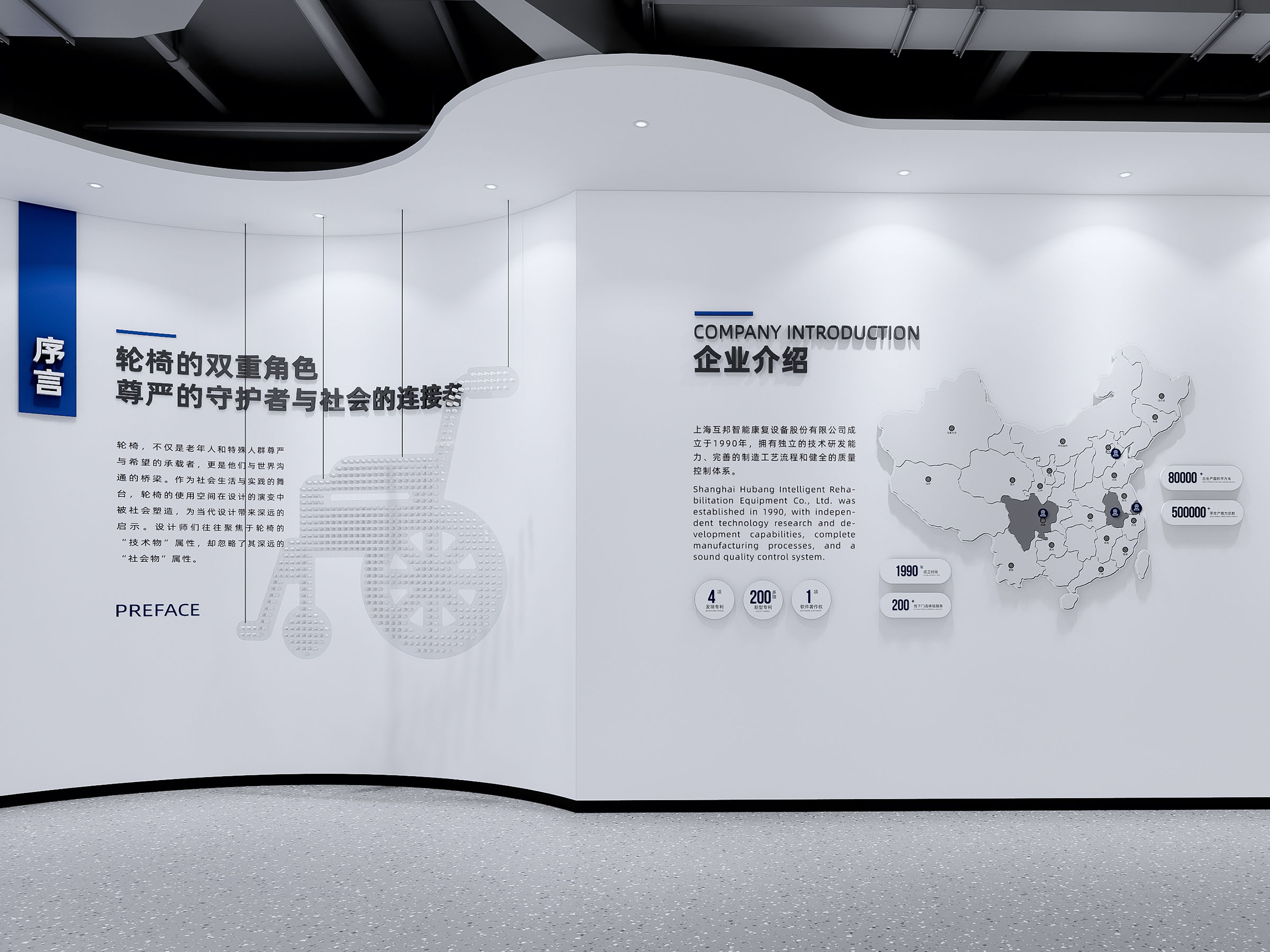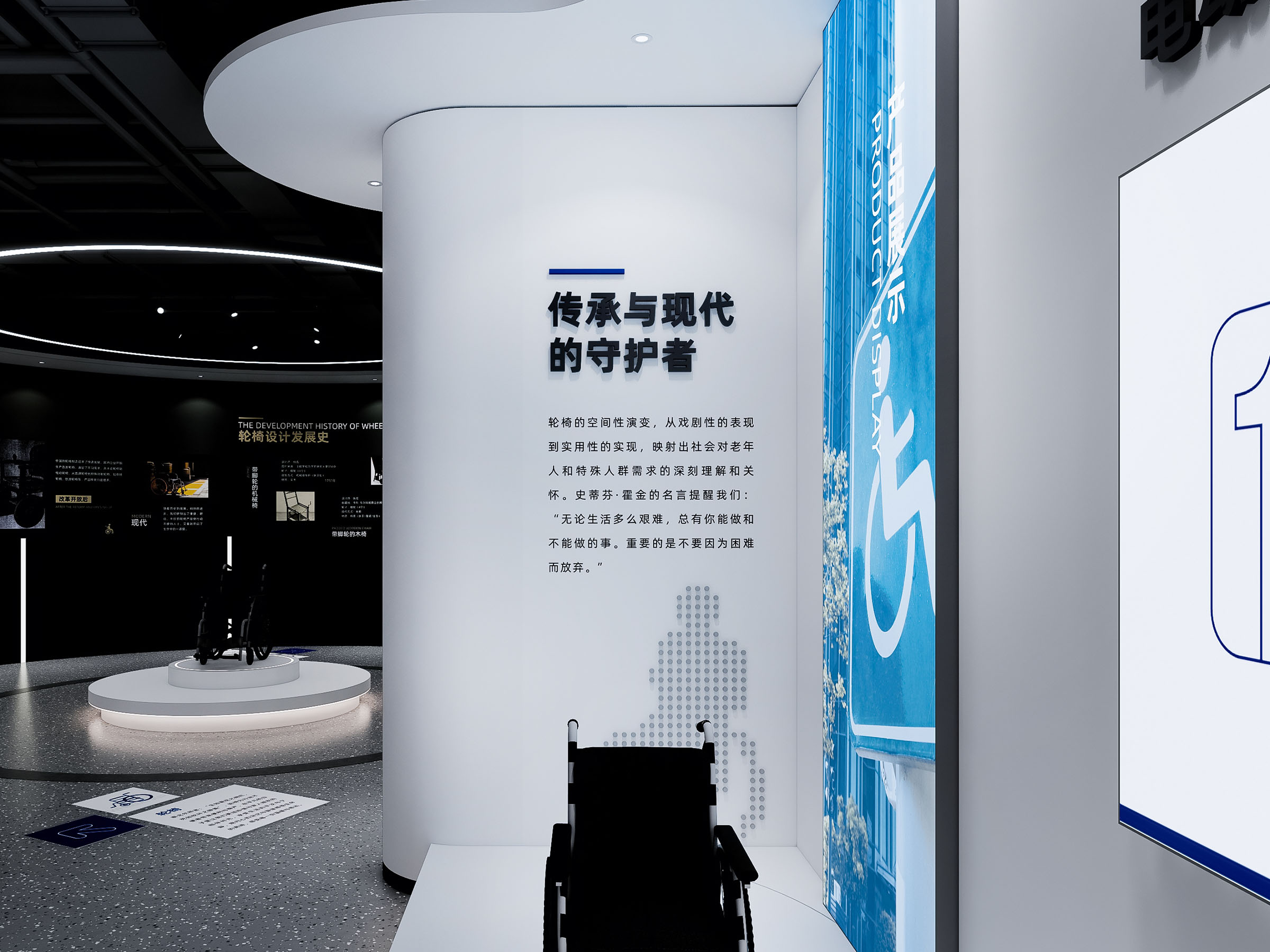 會(huì)議的第一站是互邦一樓展廳。展廳的主題是空間與權(quán)力,展廳占地面積約400平方米,進(jìn)入展廳首先映入眼簾的是序言:“輪椅,不僅是老年人和特殊人群尊嚴(yán)與希望的承載者,更是他們與世界溝通的橋梁。”這段文字深刻揭示了輪椅的社會(huì)意義——它不僅是一種輔助工具,更是使用者尊嚴(yán)與希望的象征。