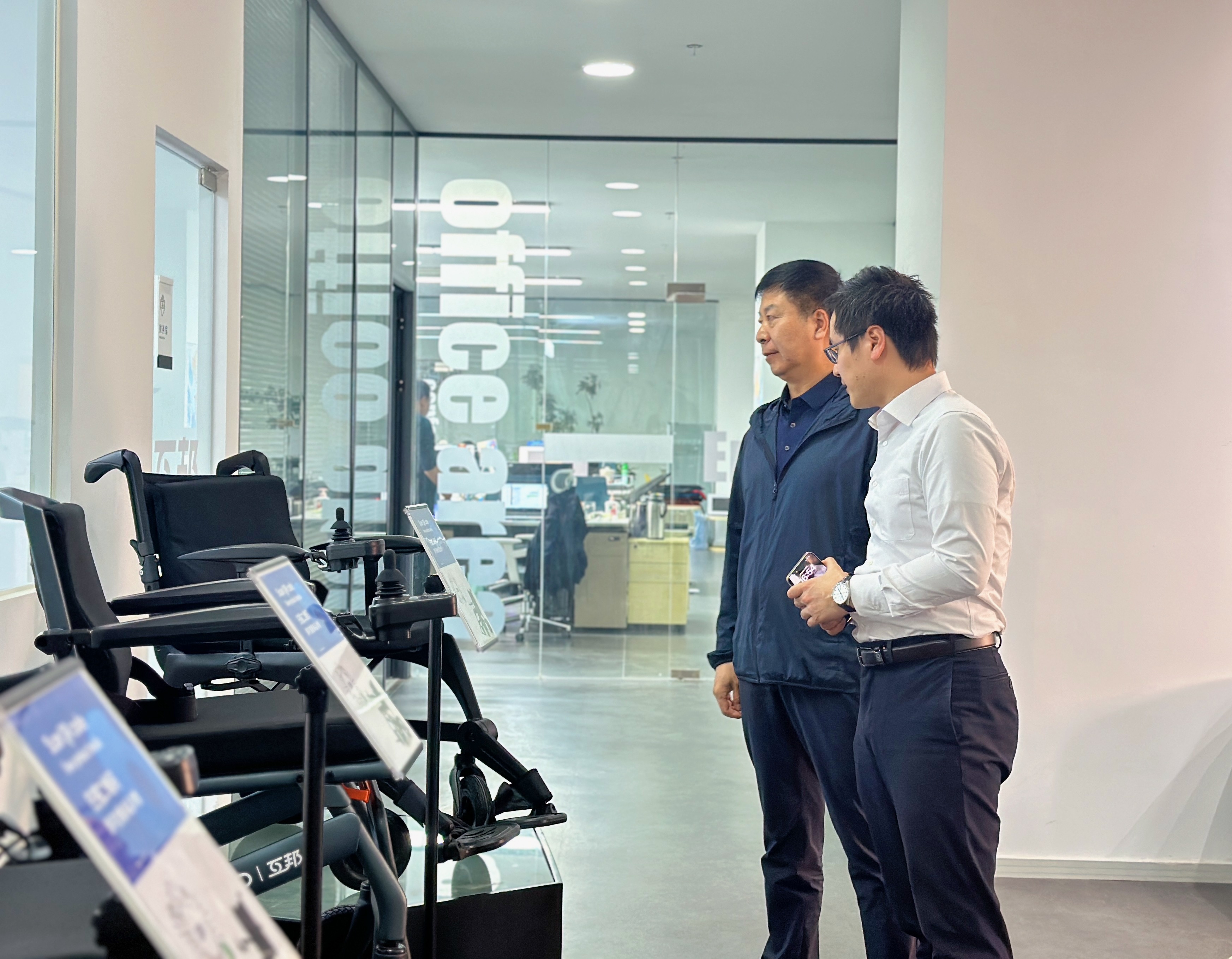 調(diào)研團隊首先參觀了上?;グ畹纳a(chǎn)車間和輪椅產(chǎn)品展示區(qū)。賀君萍總經(jīng)理為調(diào)研團隊詳細介紹了互邦公司的整體情況,并與艾紅鍔書記就遼寧省內(nèi)康復(fù)輔助器具產(chǎn)業(yè)的發(fā)展趨勢進行了深入探討。